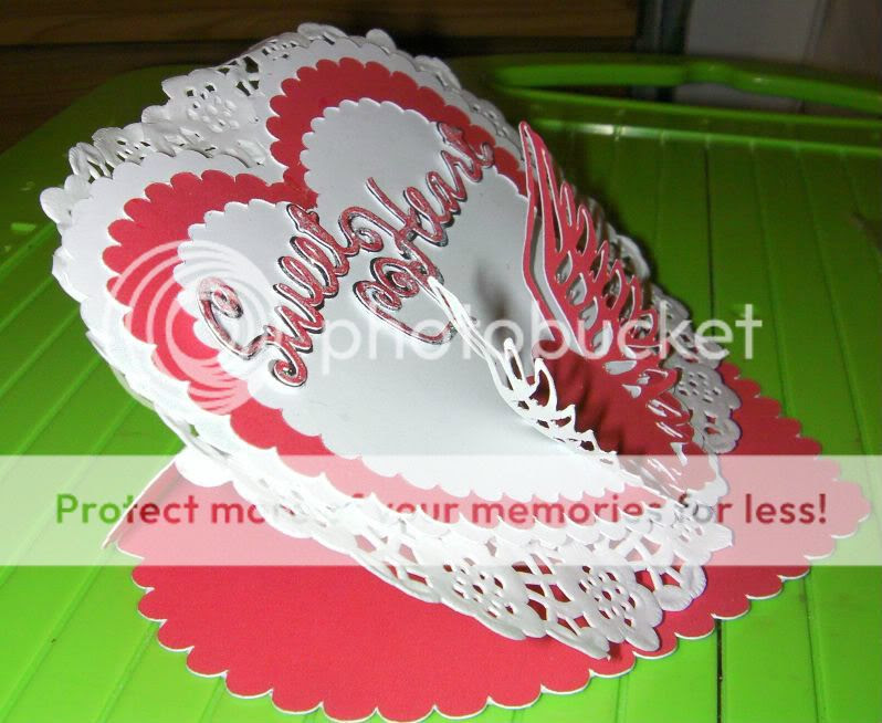 I added the red frame and then added the Sweetheart sentiment to the front of my white heart along with the matching winged heart from the now devoured cupcake :)